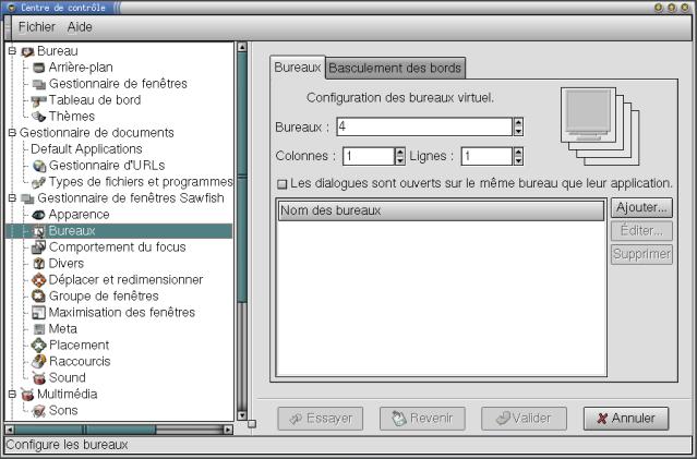 le nombre de bureaux dont vous voulez disposer. Le concept de bureau est quelque-chose inconnu des utilisateurs de Windows, qui ne peuvent avoir qu'un seul bureau. Les utilisateurs de Linux ont la possibilité d'avoir plusieurs bureaux, et de passer de l'un à l'autre très simplement. Un bureau est une sorte d'écran virtuel, et un seul bureau n'est affiché à la fois. Vous verrez, c'est très pratique...